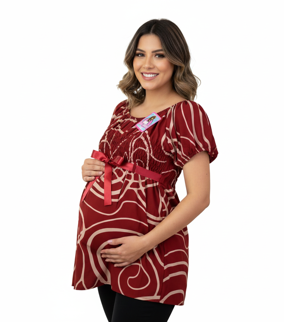 Esta blusa materna es la combinación perfecta de comodidad y estilo para la futura mamá. Su diseño en color vinotinto con delicadas rayas beige es moderno y versátil, ideal para cualquier ocasión.