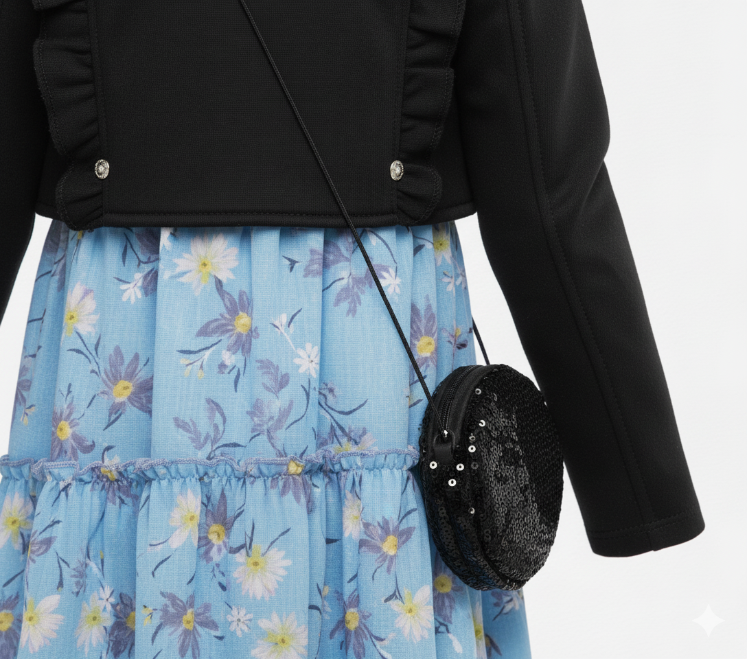 - Mini Cartera con Brillos: El accesorio ideal. Una pequeña cartera negra con un toque de brillo que complementa a la perfección y permite a tu niña llevar sus pequeños tesoros.
