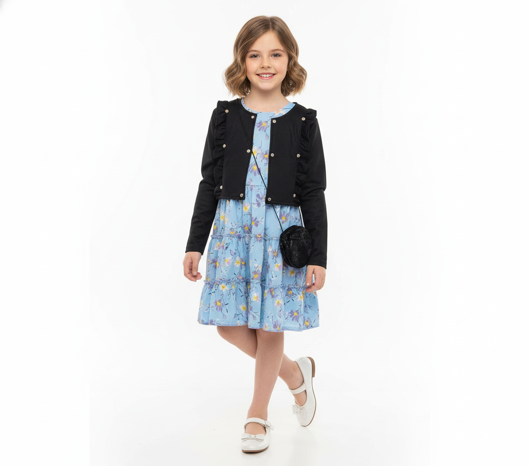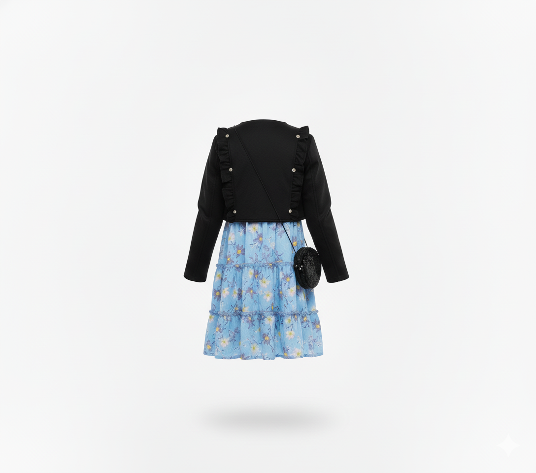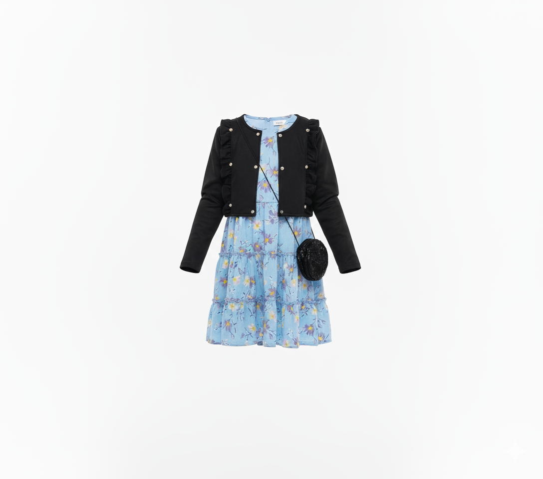 Presentamos el conjunto perfecto para cualquier ocasión: un hermoso vestido de flores que irradia frescura, combinado con una chic chaqueta negra y una adorable mini cartera.