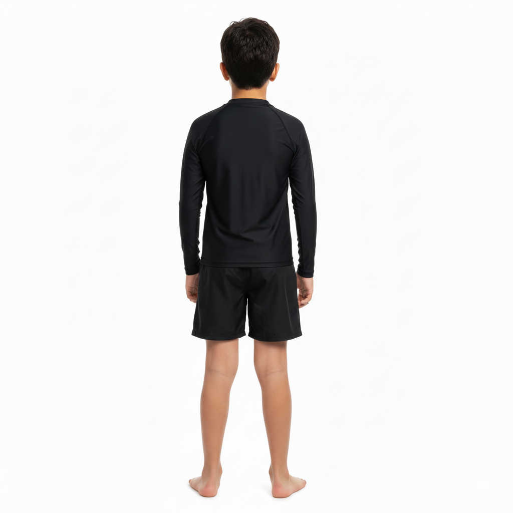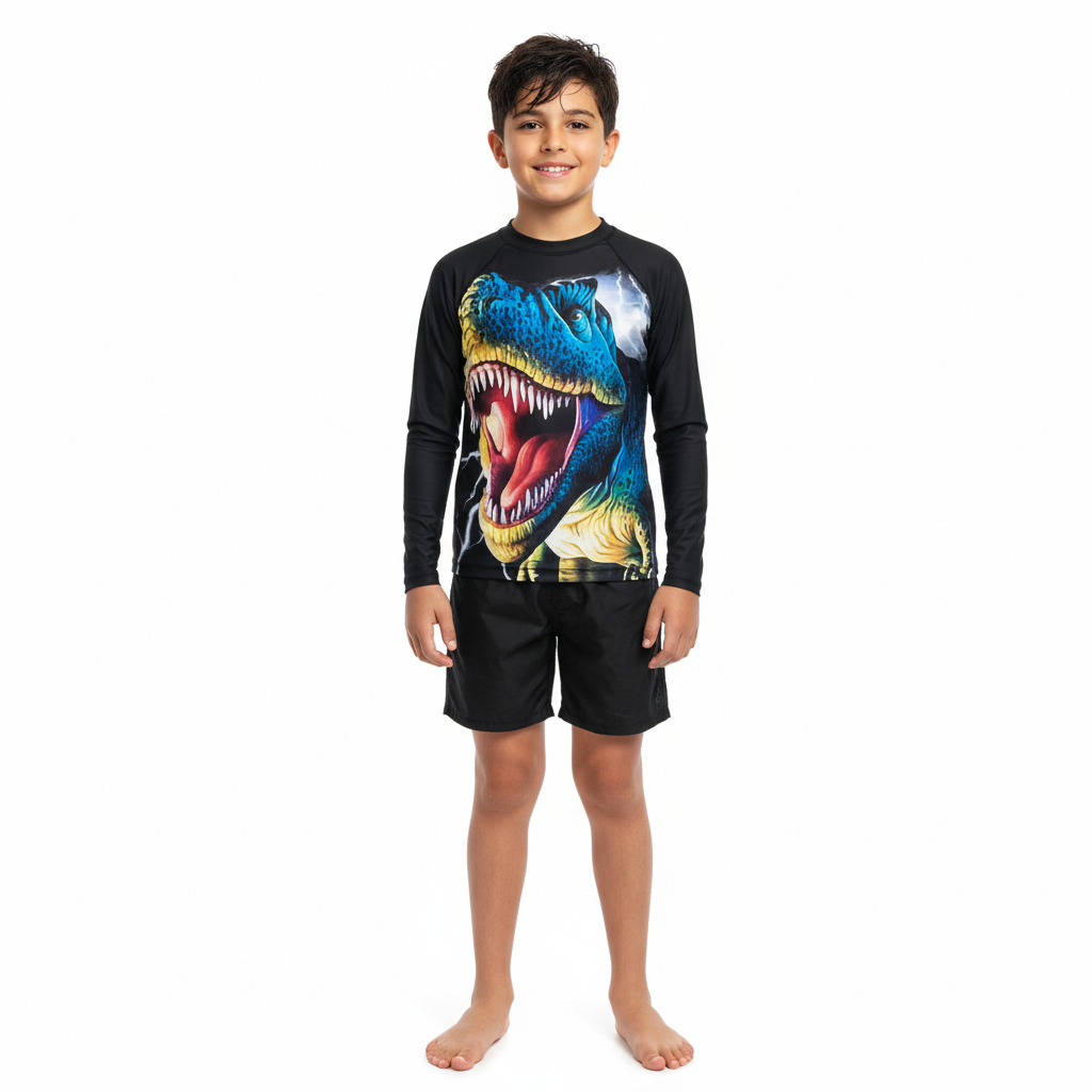 Tu pequeño explorador estará listo para rugir este verano con este increíble traje de baño negro de dinosaurio. Un diseño moderno, oscuro y con un estampado feroz que le encantará. ¡La combinación perfecta de estilo y diversión!