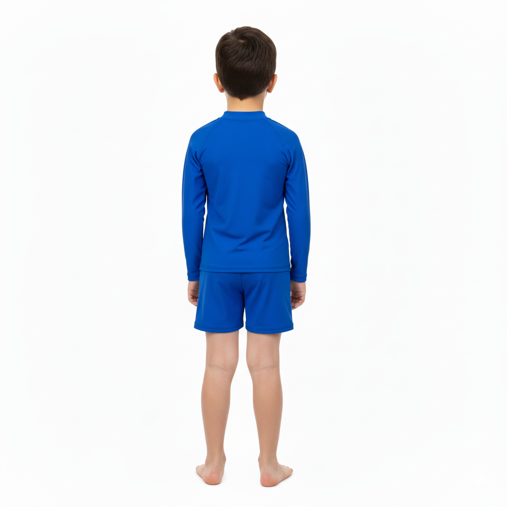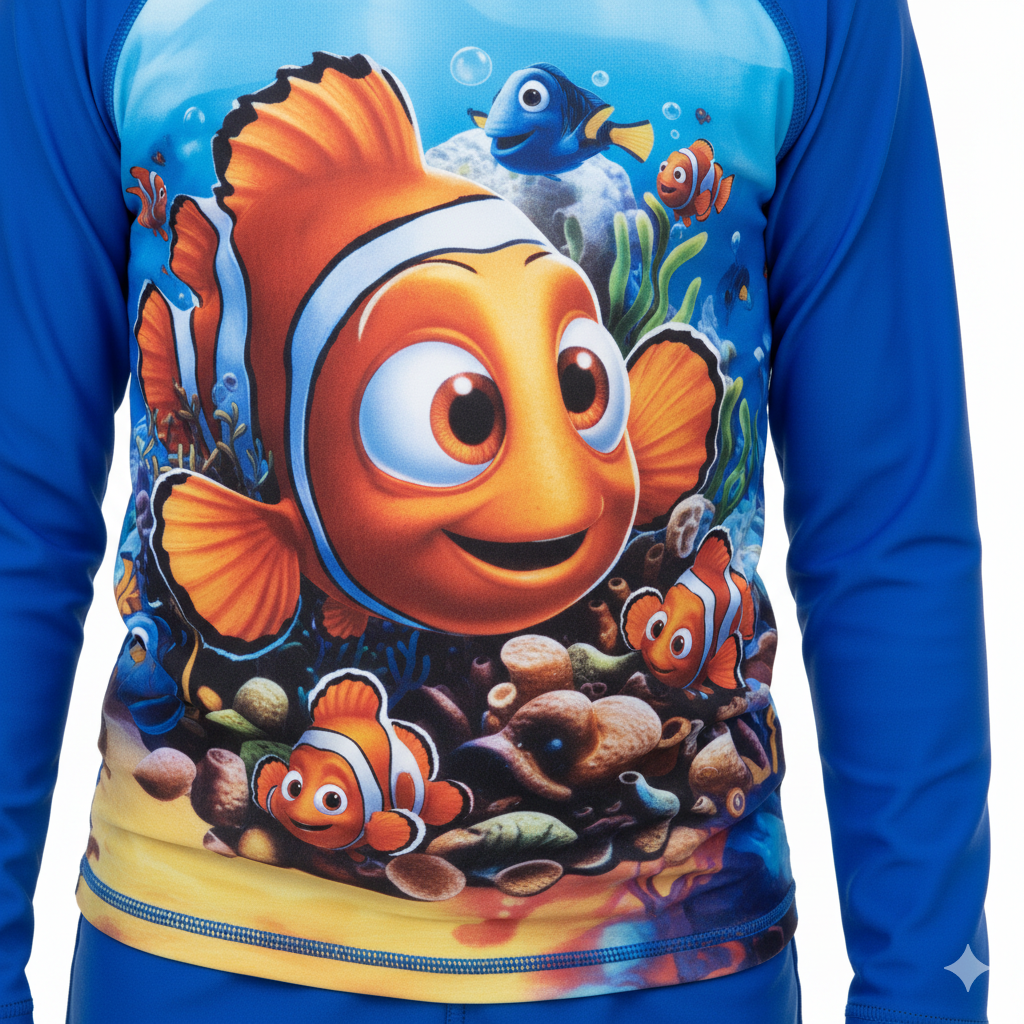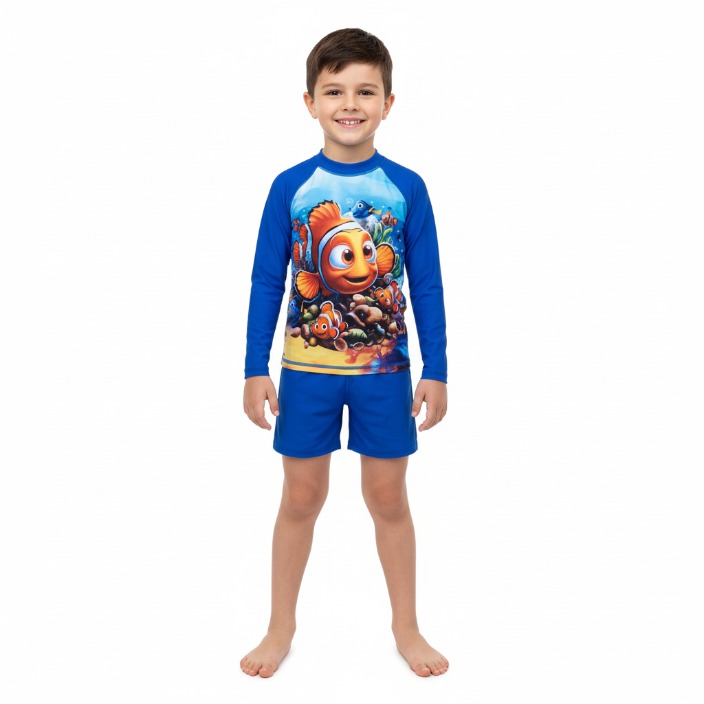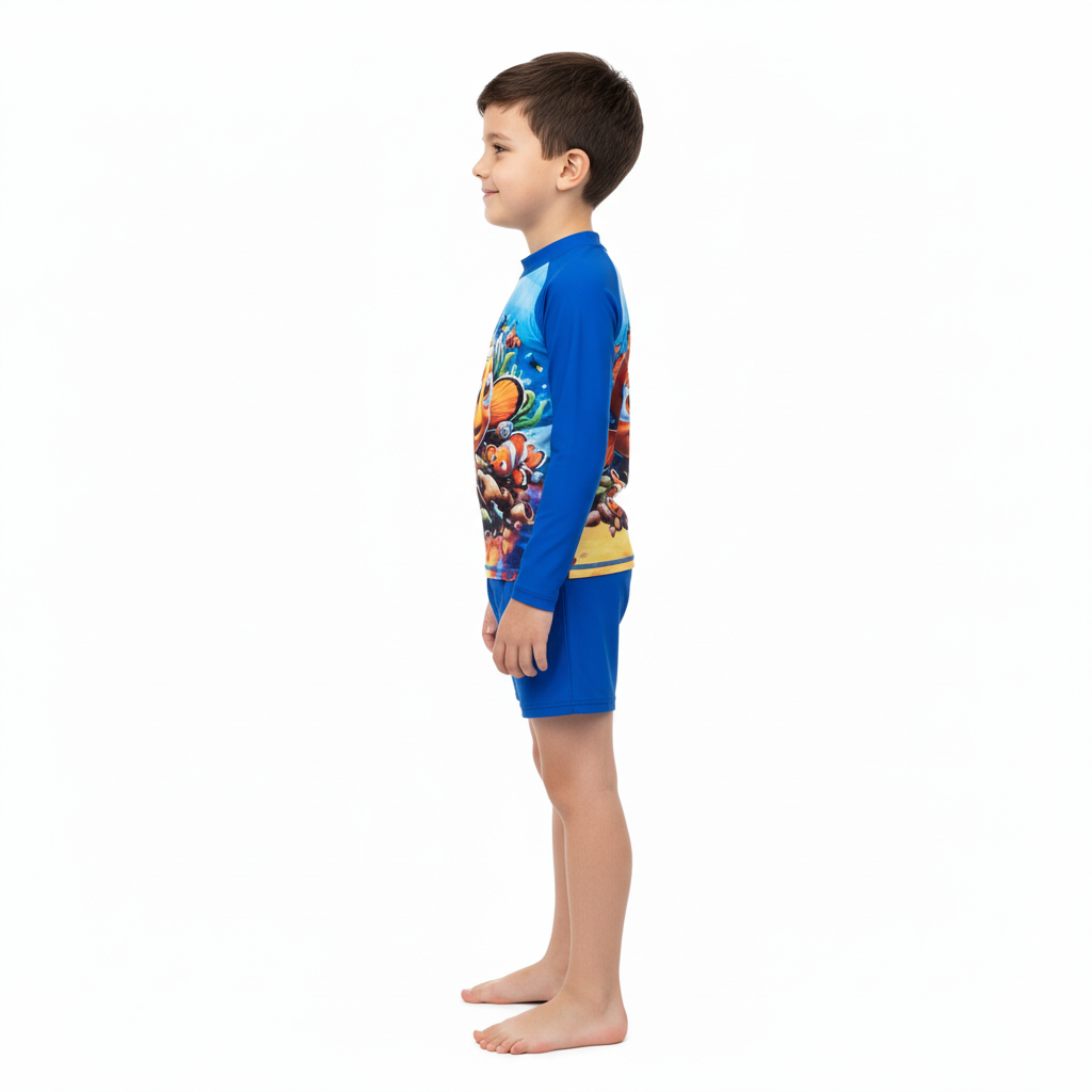 ¡El verano es para la aventura! Tu pequeño explorador acuático se sentirá como si estuviera buscando a Nemo con este vibrante traje de baño azul rey lleno de adorables peces de colores.