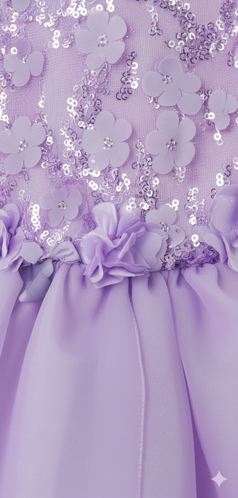 • Detalles florales y lazo chic: La cintura se embellece con delicadas flores y un lazo trasero perfectamente arreglado que añade un toque final de sofisticación.